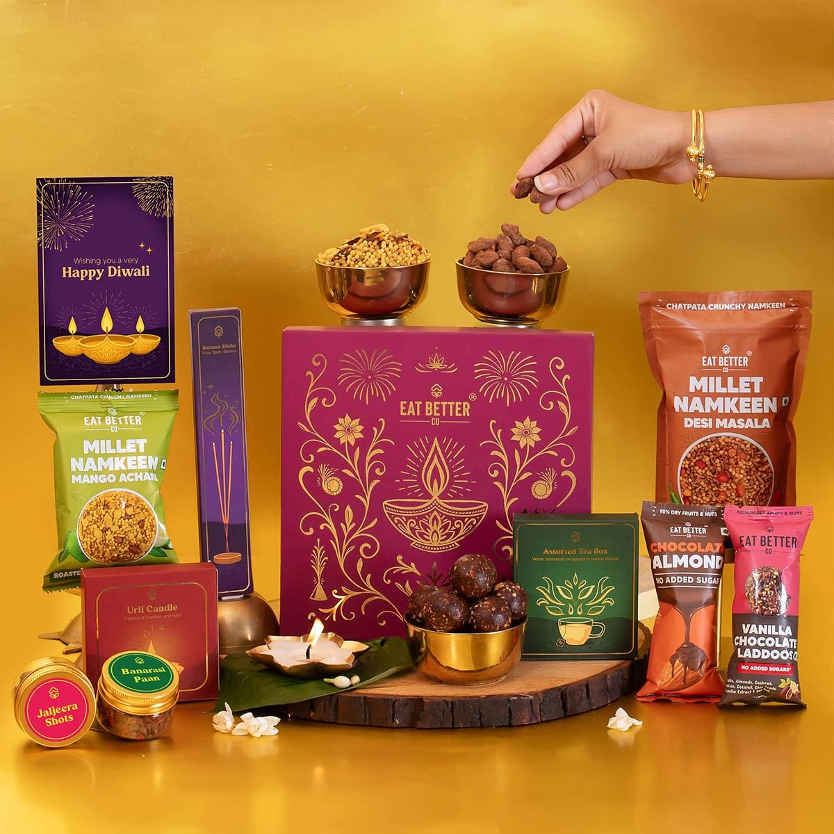 ๐ซ 10-Merchandise Curated Assortment โ Contains Urli Candle, Assorted Tea Field, Dry-Fruit Millet Namkeen, Incense Sticks, Vanilla Chocolate, Chocolate Almonds, Mango Achari Namkeen, Banarasi Paan, Jaljeera Shot, and a Greeting Card.