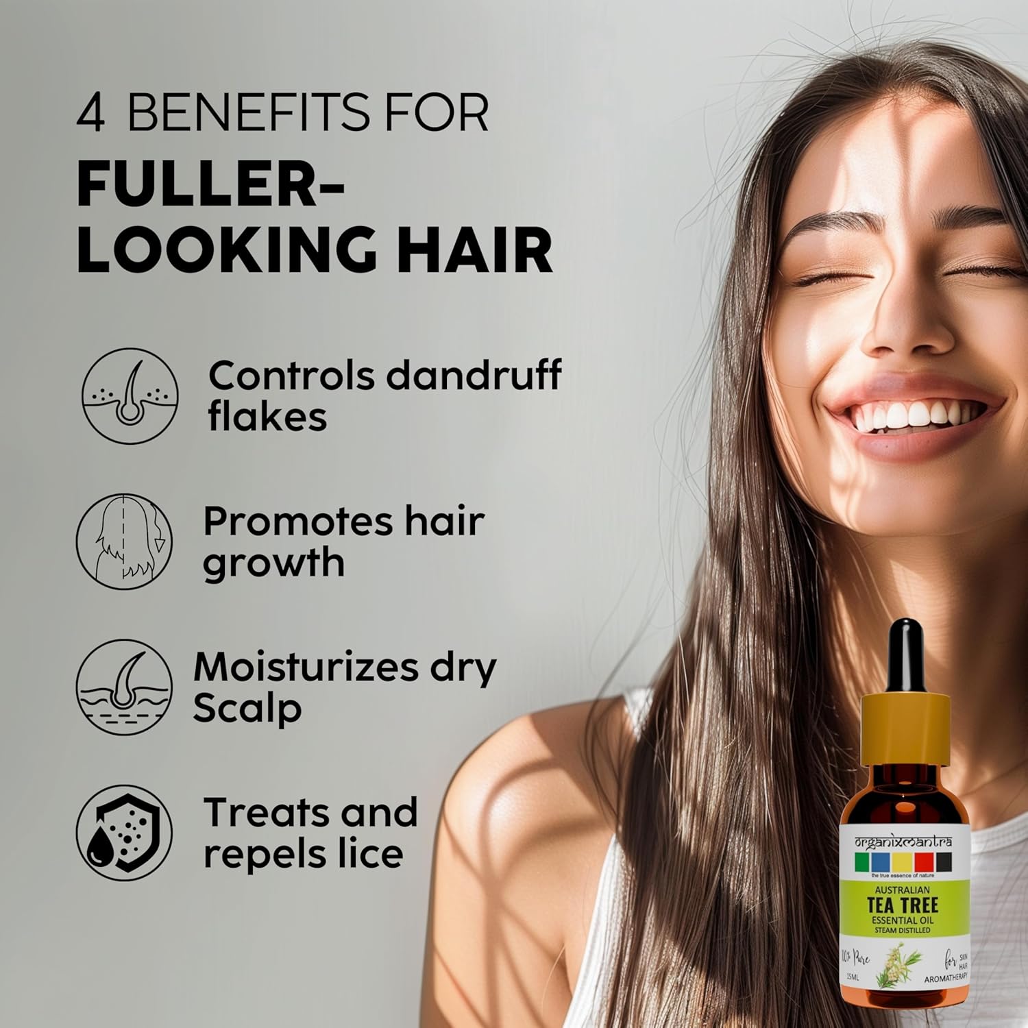 NOURISHES HAIR FOR VITALITY : Rejuvenate with our tea tree oil for hair, selling wholesome vitality. Enriched with important vitamins, it stimulates the scalp for stronger, fuller locks. Bid farewell to dryness because it restores moisture, leaving hair tender and manageable.