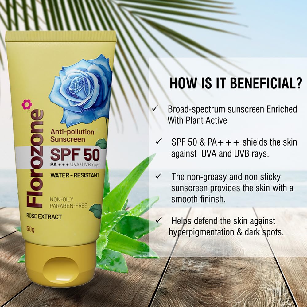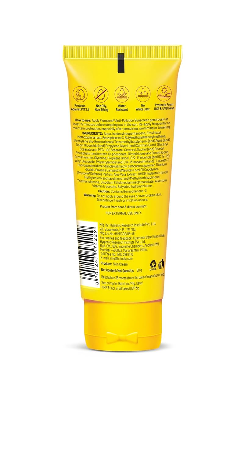 Generic Name : Florozone Anti-Pollution Cream Sunscreen SPF 50 Sun+Pollution Protection with Aloe Vera, 50g