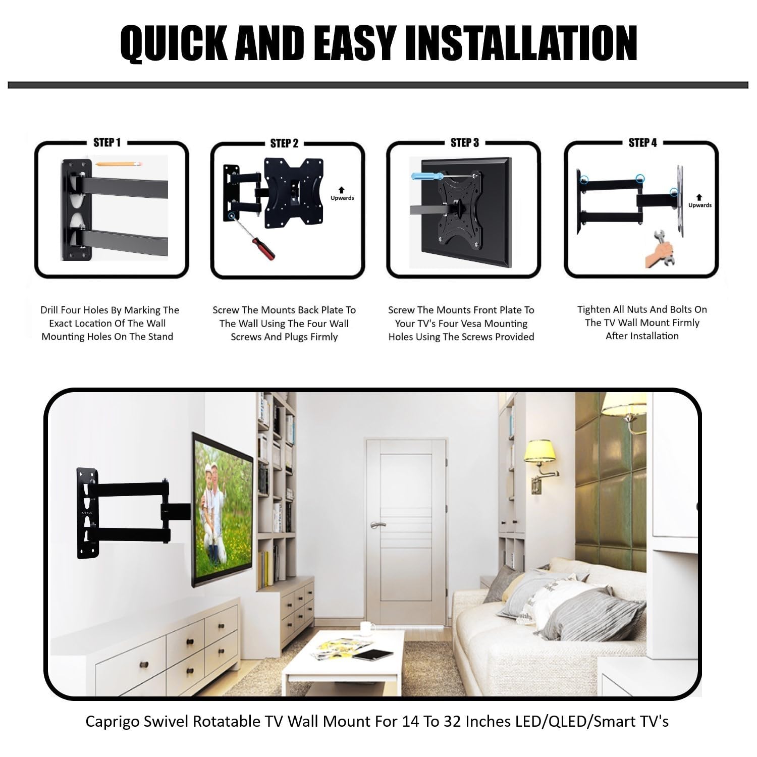 Premium Heavy Obligation Construct QualityUniversal Model CompatibilityTV Dimension Compatibility : 14 To 32 InchesTV Sort Suitability : LED/HD/QLED/Sensible TV’sMin Vesa Compatibility : 50 x 50 mm (5 x 5cm)Max Vesa Compatibility : 200 x 200 mm (20 x 20cm)Full Movement Movable & Adjustable TV MountSmooth Swivel Rotation : +/- 90 DegreesEasy Tilt Changes : +/- 15 DegreesExtend & Retract Changes : 2.5 To 14 InchesSolid & Sturdy Thick Metallic ConstructionSafe, Safe & Sturdiness Examined TV StandSimple, Fast & Simple InstallationPremium Screw Set & DIY Handbook Included