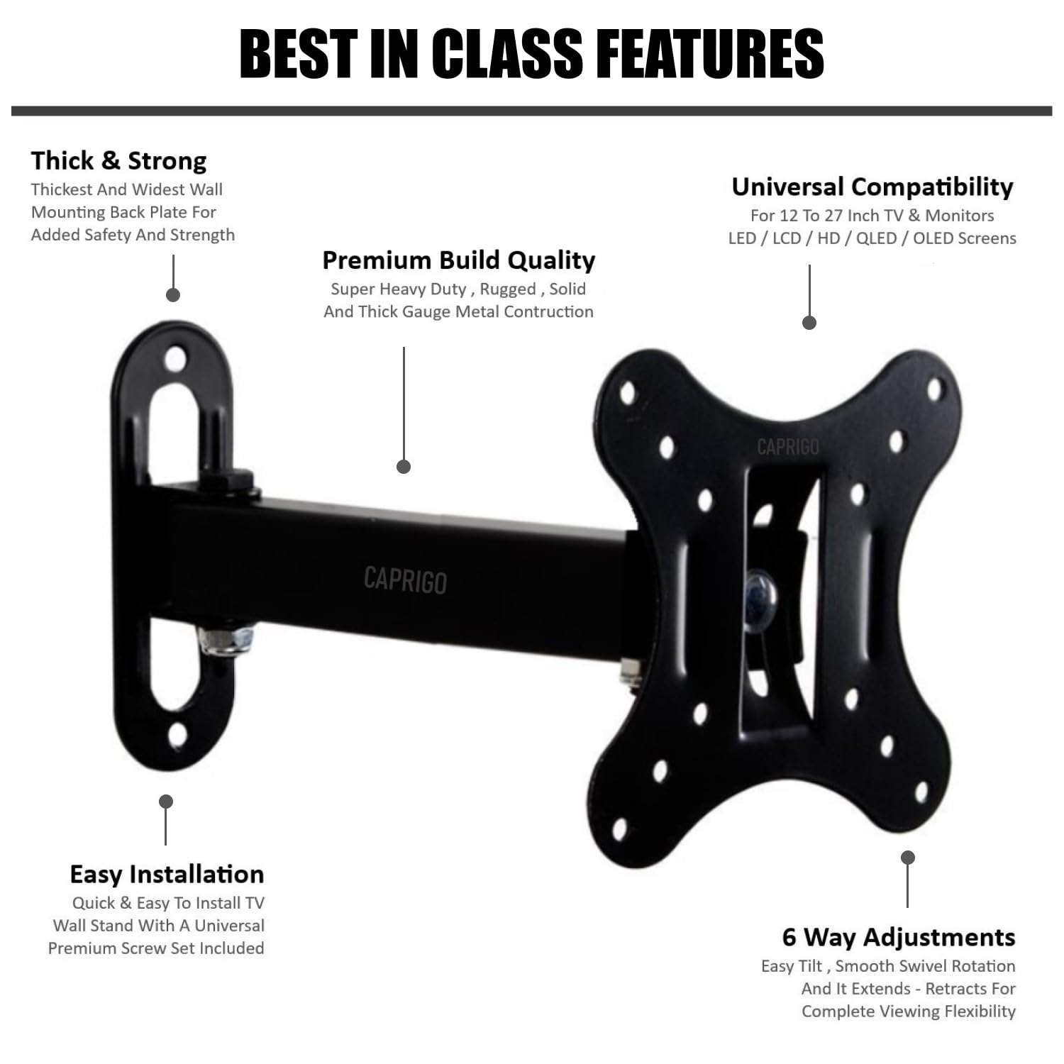 Premium Heavy Responsibility Construct QualityUniversal Model CompatibilityScreen Dimension Compatibility : 12 To 27 inchesScreen Compatibility : TV & Monitor’sScreen Kind : LED, LCD, HD & Curved Display’sMin Vesa Compatibility : 50 x 50 mmMax Vesa Compatibility : 100 x100 mmSmooth Swivel Rotation : +/- 90 DegreesTilt Angle Adjustment : +/- 15 DegreesExtend & Retract Adjustment : 2 To 7 InchesRobust & Strong Thick Gauge Steel ConstructionDurable, Protected & Safe Monitor Wall StandSimple, Fast & Straightforward InstallationPremium Common Screw Set IncludedSimple DIY Set up Handbook Offered
