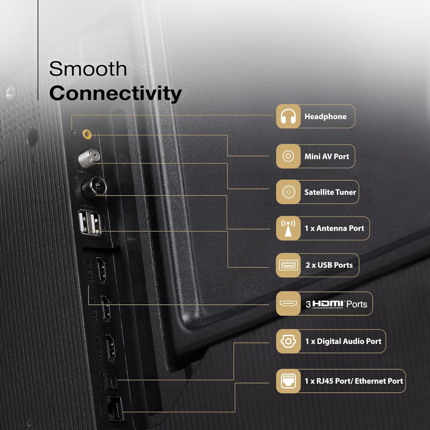 Connectivity: 3 HDMI ports to attach a number of gadgets | 2 USB ports to attach laborious drives and different USB gadgets|AV In|RJ45|Optical out for sound|Wi-Fi|Antenna|Bluetooth 5.1|Ethernet|ARC|eARC